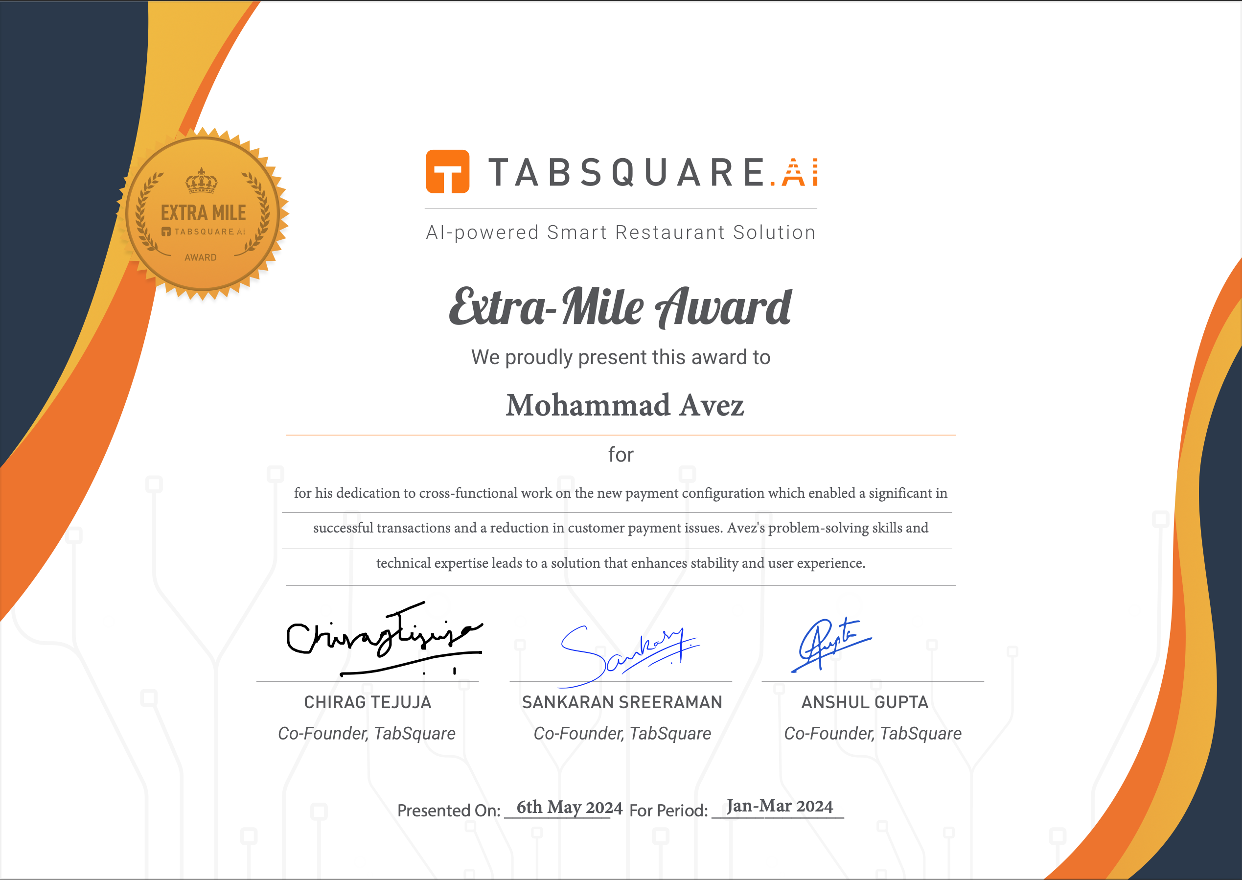 This award was presented for his dedication to cross-functional work on the new payment configuration which enabled a significant in successful transactions and a reduction in customer payment issues. Avez's problem-solving skills and technical expertise leads to a solution that enhances stability and user experience.