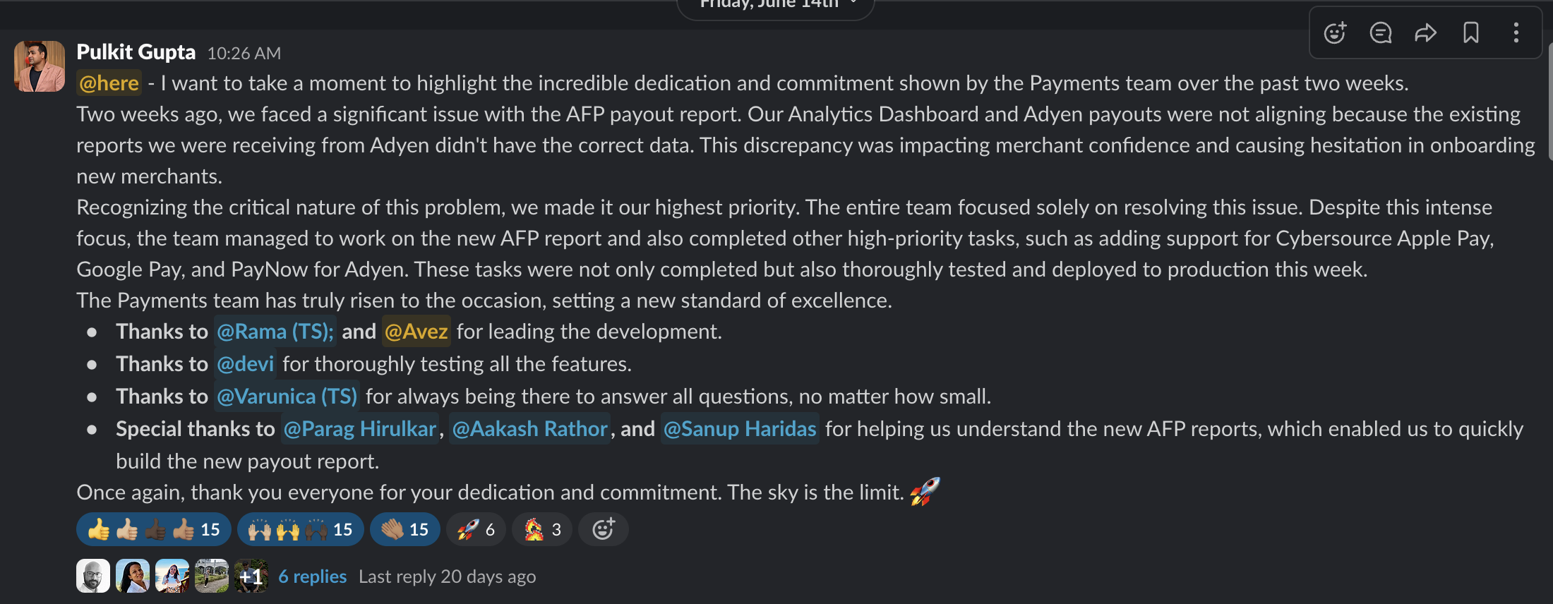 Solid performance by involved in the Payment terminal and Payment API launch! Not only was a lot of deep collaboration required, but a lot of effort upfront to ensure we have the right design standards, good API design practices, think through edge case and long tail errors, as well as focus explicitly on launch stabilization and monitoring. It is a testament to how great systems can be designed, built and launched successfully (and quickly!)
