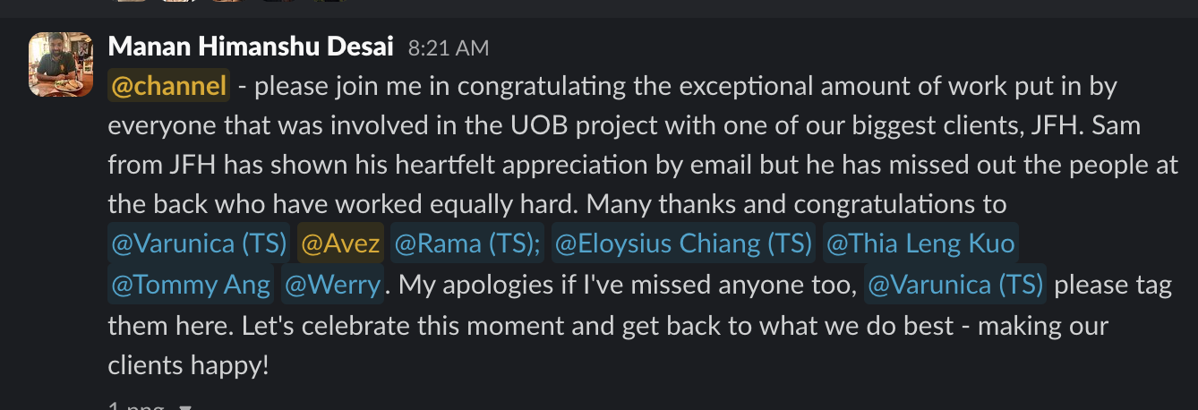 This award was presented for successfully delivering several key projects that have directly benefited the business and strengthened client relationships. This includes AFP Report Enhancement, Cybersource Integration, AFP AU, Paynow, etc.